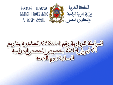 في ما يلي المراسلة الوزارية رقم 14×038  الصادرة بتاريخ 01 أبريل 2014 بخصوص  الحصص الدراسية المسائية ليوم الجمعة: