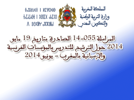 في ما يلي المراسلة 055-14 الصادرة بتاريخ 19 مايو 2014 حول الترشيح للتدريس بالمؤسسات الفرنسية والإسبانية بالمغرب - يونيو 2014