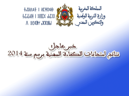تنهي وزارة التربية الوطنية والتكوين المهني أنه تم الإعلان عن النتائـج النهائيـة لامتحانات الكفاءة المهنية الخاصة بجميـع الهيئـات والفئـات لسنة 2014،